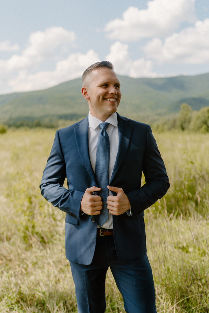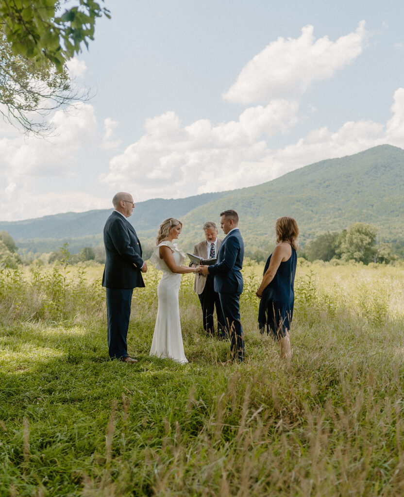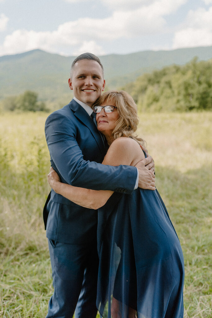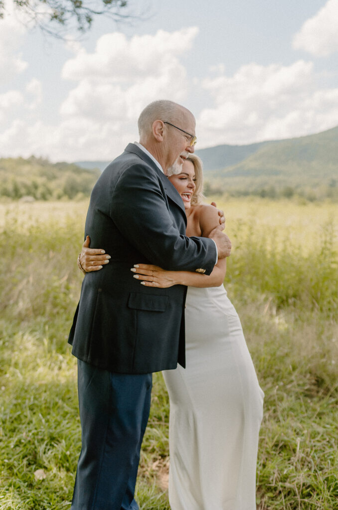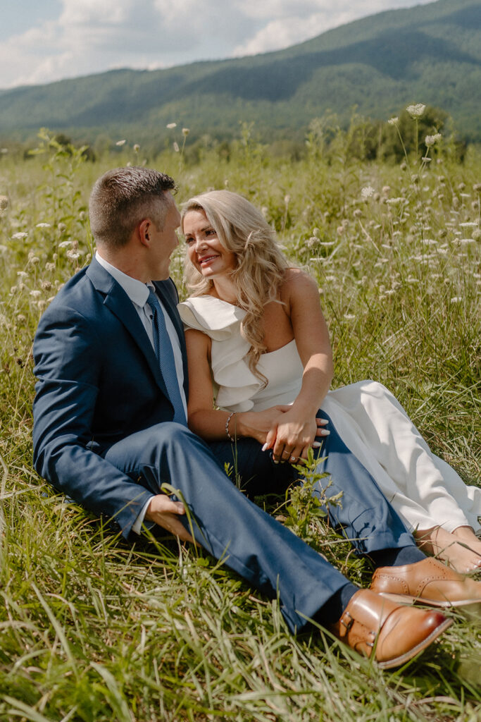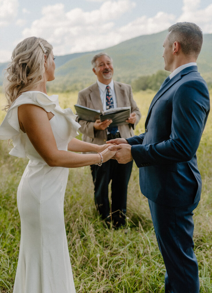 They spent the morning getting ready in a nearby cabin, surrounded by wildflowers and sunlight pouring through the windows. When it came time to say their vows, we drove through Cades Cove, stopping along the winding roads for quiet, golden-hour portraits that looked straight out of a film.
